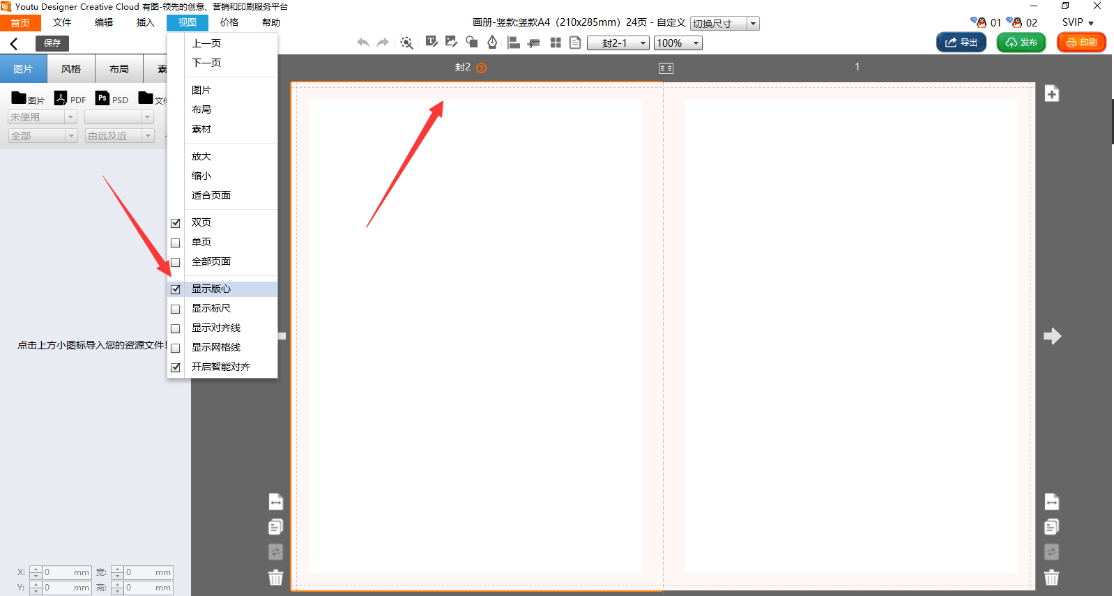 1.首先,排版时尽量显示版心,在菜单“视图”下勾选“显示版心”,在编辑区域就会出现一个浅红色边框,这个线框以内就是版心区,如下图所示:
